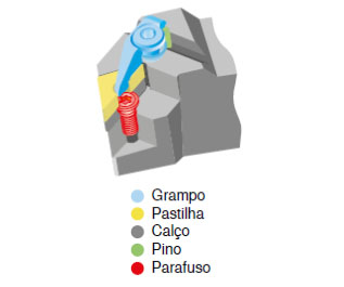 - Grampo, calço e o parafuso de fixação (elemento de fixação) = peças separadas