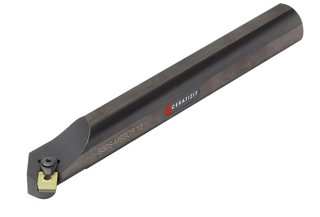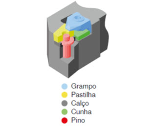 Inserto com ângulo de folga de 7° (sete graus). É fixado com um calço e grampo de bloqueio a um pino fixo. Até três arestas de corte podem ser utilizadas sem a necessidade de alterar o aperto (uma face de contato).